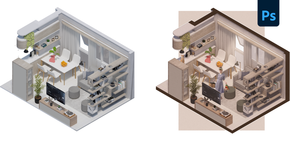 - Exporting the outlines/edges in Sketchup, editing their width in Illustrator, then importing to Photoshop as a Linked File (so every change made in the width, color or position of the edges can be updated automatically);